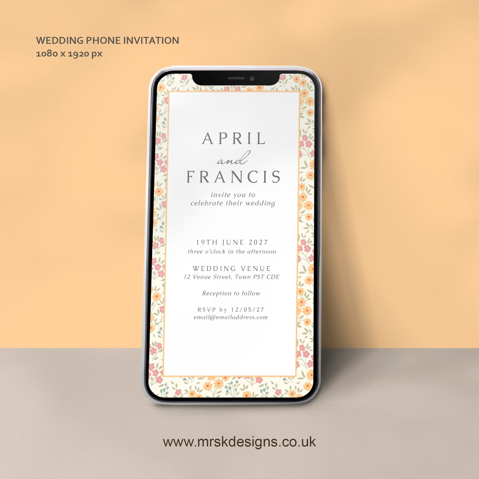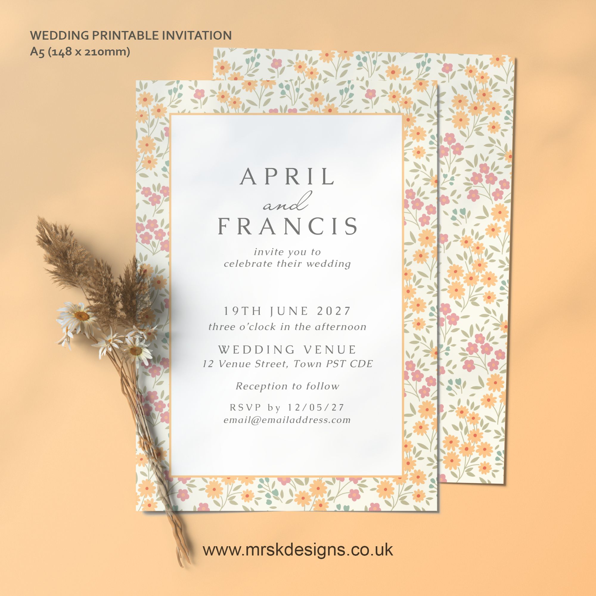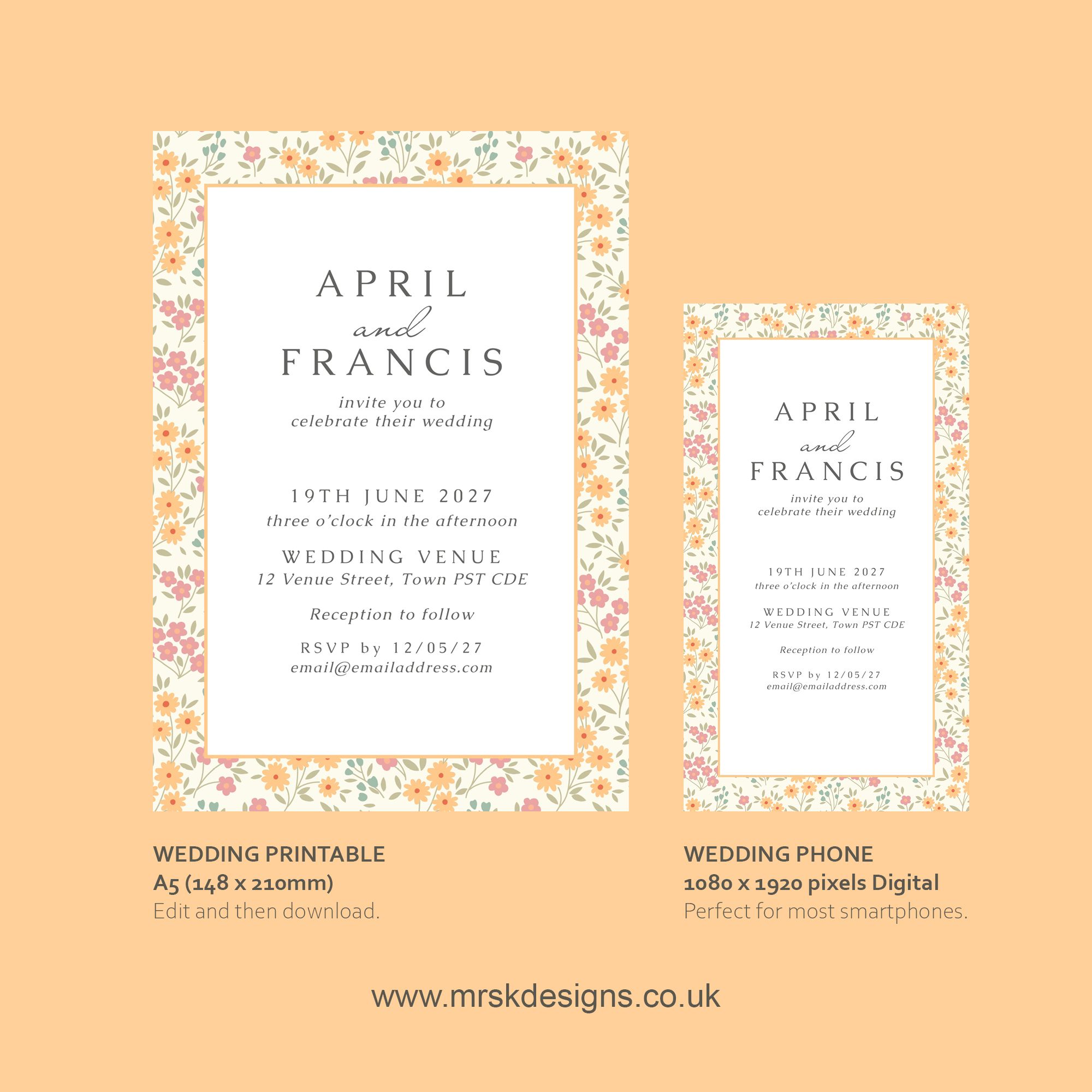 Delicate yellow Spring, hand-drawn, floral theme, elegant wedding Invitation. This is a digital file template that you can download today, edit yourself and print at home or at your local printers. Your purchase also comes with a digital smartphone sized invitation to Whatsapp or message to loved ones.
