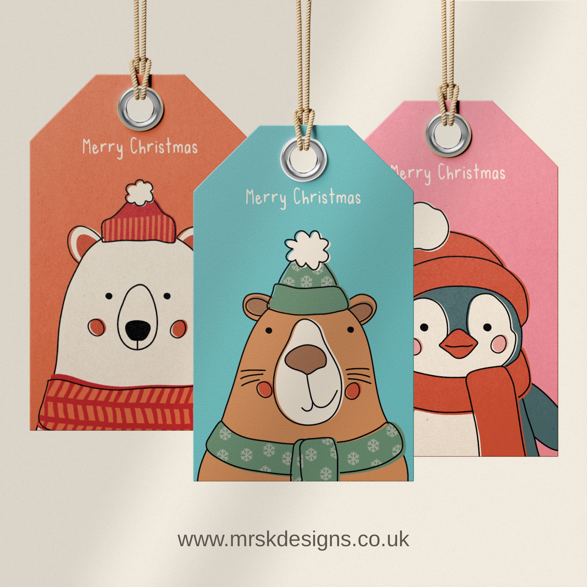 These fun, colourful, animal character gift tags will help bring your Christmas Present wrapping to life. The listing includes printable versions of all three gift tags - the cute Penguin in his Winter hat, Polar Bear in his fluffy scarf and a Capybara ready to face the cold.