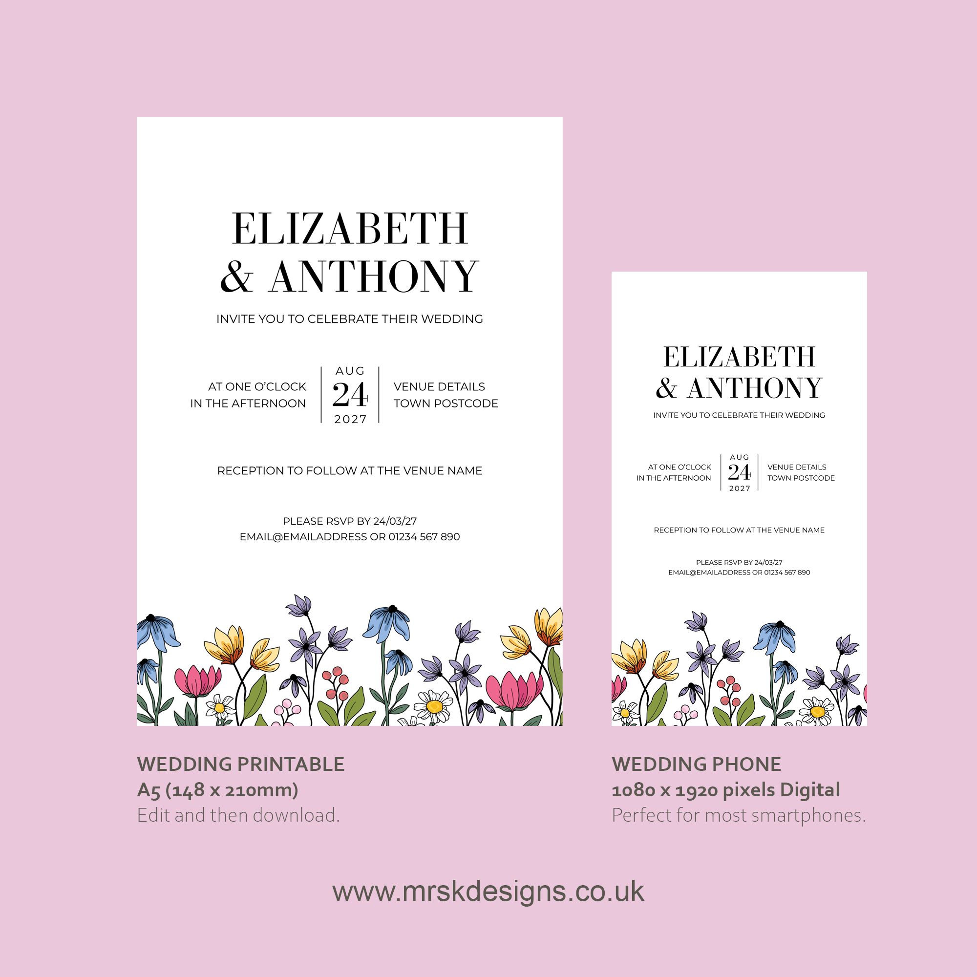 Beautiful hand-drawn, colourful, Spring floral theme wedding Invitation. This is a digital file template that you can download today, edit yourself and print at home or at your local printers. Your purchase also comes with a digital smartphone sized invitation to Whatsapp or message to loved ones.