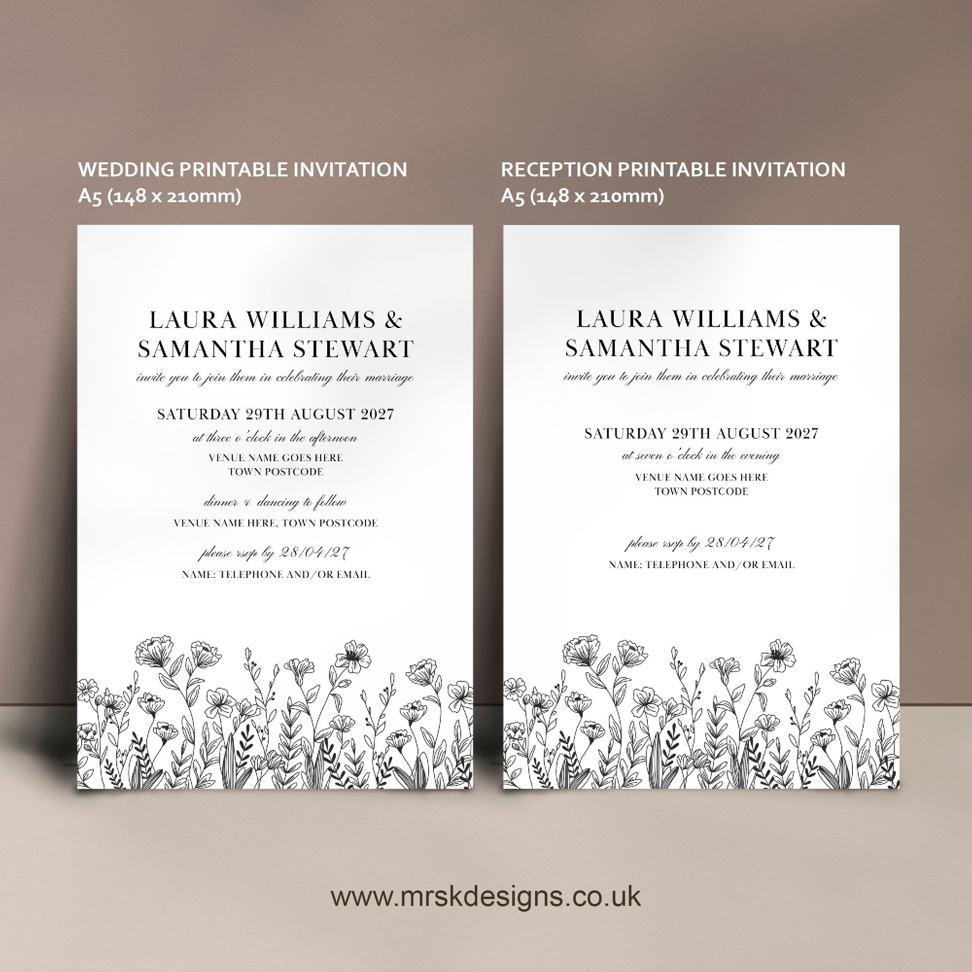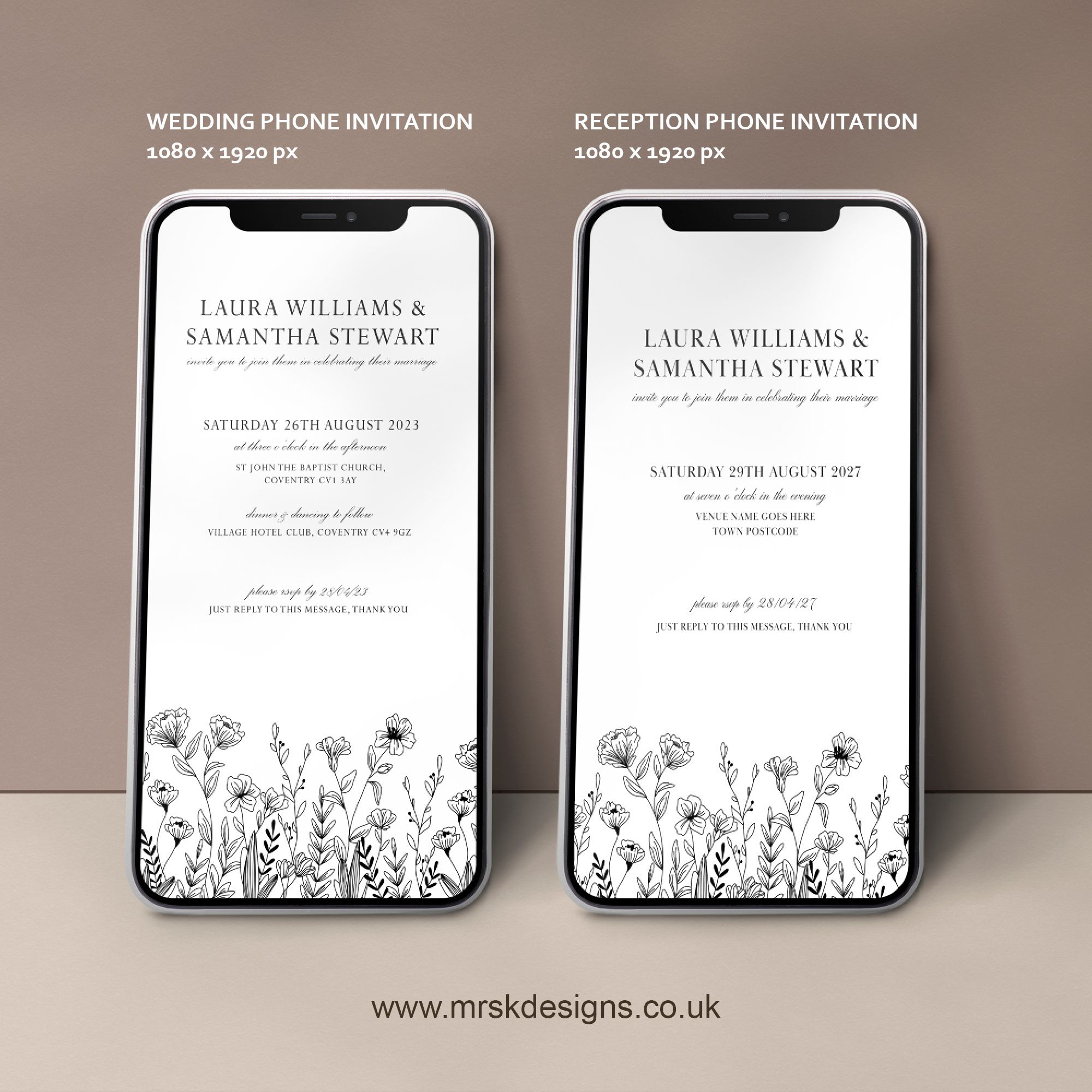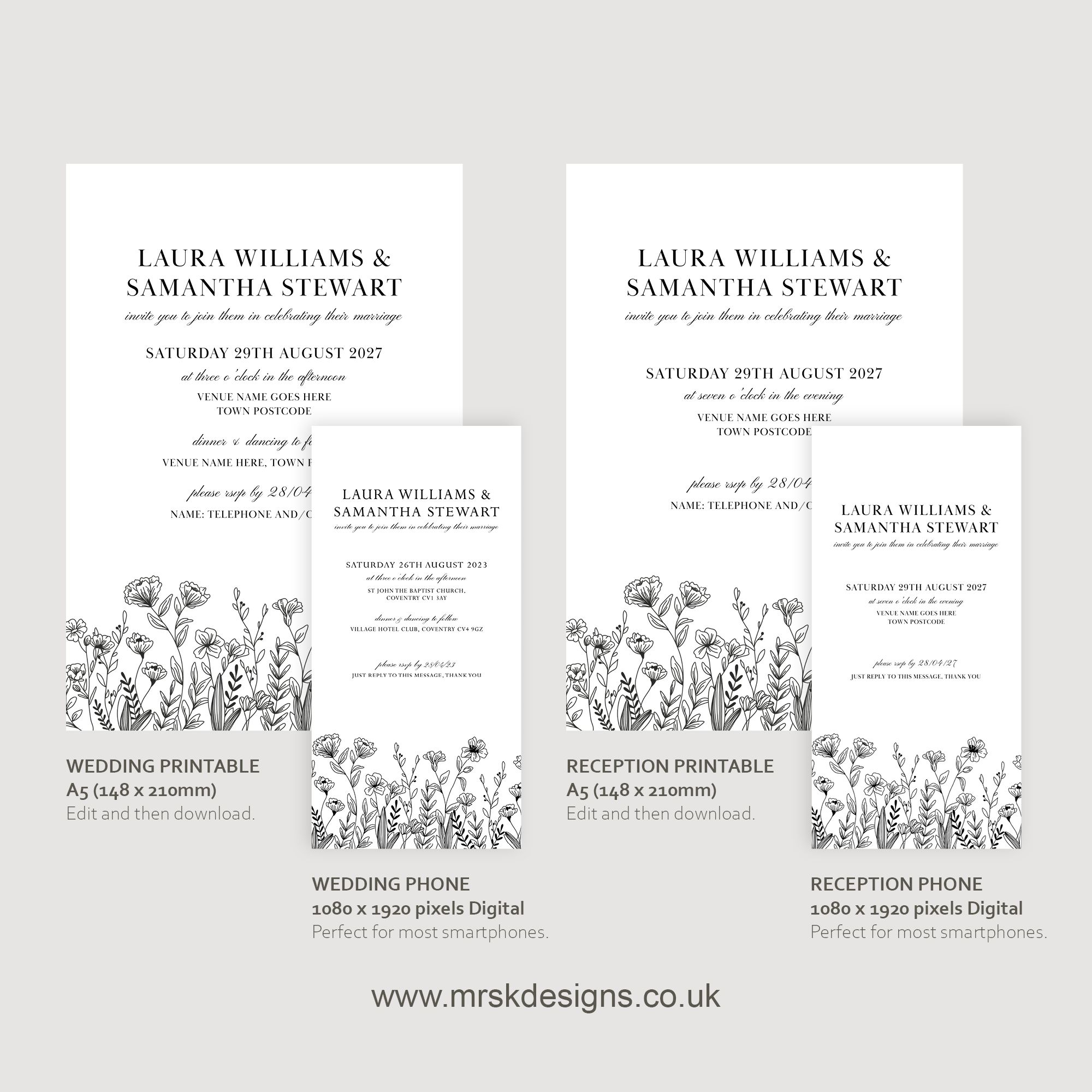 Beautiful hand-drawn, black and white theme, elegant wedding Invitation. This is a digital file template that you can download today, edit yourself and print at home or at your local printers. Your purchase also comes with a digital smartphone sized invitation to Whatsapp or message to loved ones.